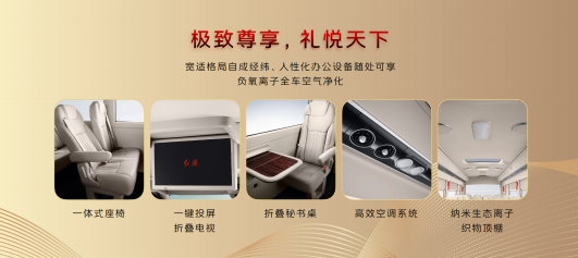 极致尊享,礼悦天下。对于中型礼宾车来说,车内空间与乘坐感至关重要,红旗国悦洞察、适应多种场景,提供17、19、20、23座位的多样化布局,实现同级领先的空间设计,宽适格局自成经纬,以怡然自得的驾乘感受为用户赋予高品质出行体验;搭载一体式座椅、可一键投屏的折叠电视,折叠秘书桌、高效空调系统,人性化办公设备随处可享,充分满足出行途中的办公、汇报需求;并创新应用纳米生态离子织物顶棚,持续释放负氧离子,主动净化全车空气,打造时刻净洁、健康的驾乘环境,安坐其中,尽享从容安康、宾至如归的温雅氛围。