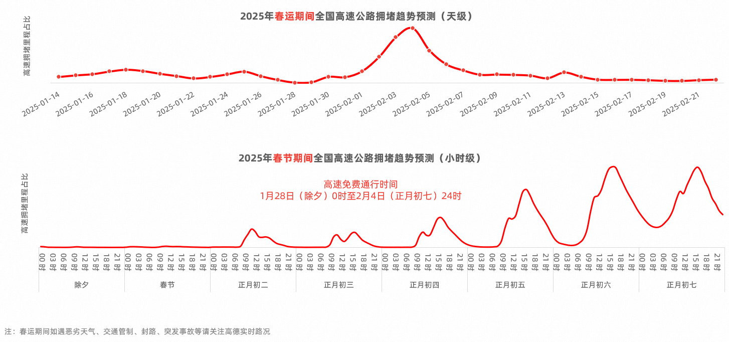 受春节假期提前出行影响,预计全国高速出程高峰为2025年1月18日(腊月十九)、 1月19日(腊月二十)、以及1月25日(腊月廿六),公众出行较为分散。而随着公众错峰意识日益加强,预计返程高峰将出现在2月3日(正月初六)、2月4日(正月初七)的14时至19时。此外,受走亲访友传统的影响,预计1月30日(正月初二)11时至12时全国高速会有一个拥堵小高峰。