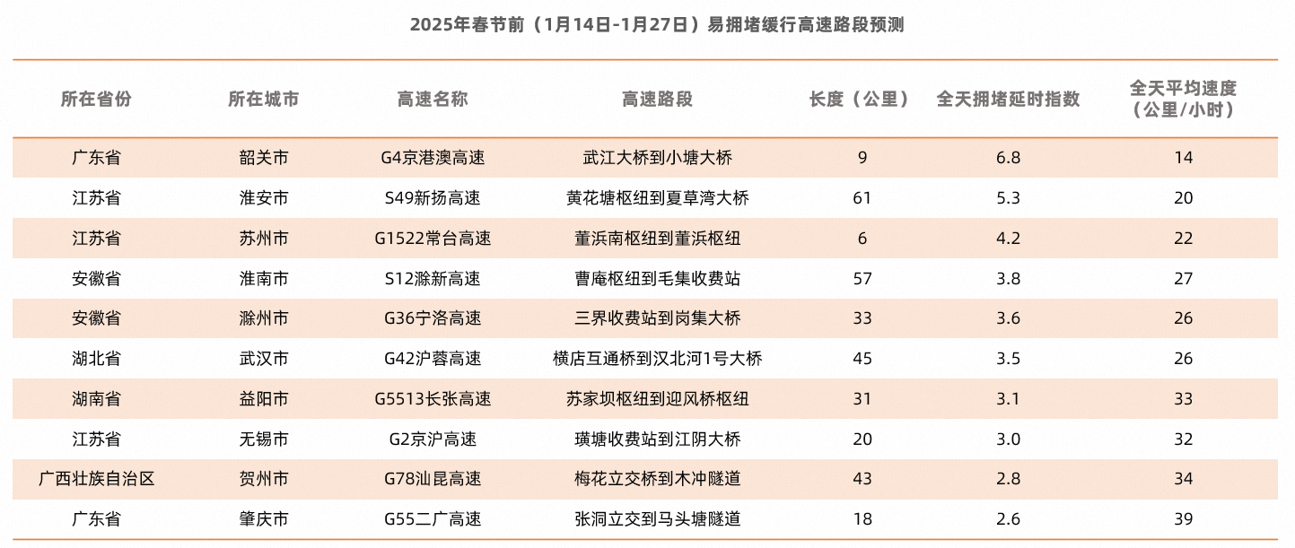 春节前(1月14日至1月27日),预计全国高速拥堵路段主要集中在粤港澳大湾区、长三角等地区,以及受天气影响较大的湖南、湖北、广西等地。其中G4京港澳高速韶关段(武江大桥到小塘大桥),全天拥堵延时指数约为6.8,全天平均车速约14公里/小时,成为最拥堵路段。