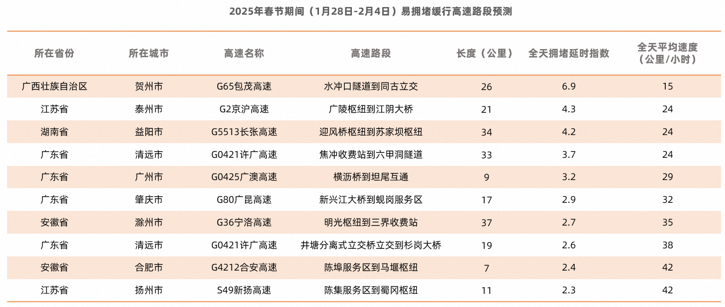 春节期间(1月28日至2月4日),预计全国高速易拥堵缓行路段主要为 G65包茂高速贺州段(水冲口隧道到同古立交),全天拥堵延时指数约为6.9,全天平均车速约15公里/小时。其次是G2京沪高速泰州段、G5513长张高速益阳段等。