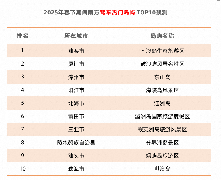 而对于喜欢海滨风光的游客来说,南方的岛屿同样不容错过。预计春节期间,南方汕头市南澳岛生态旅游区以其美丽的海滩和丰富的生态资源而受到青睐排名热门自驾岛屿第一,厦门市鼓浪屿风景名胜区、漳州市东山岛、阳江市海陵岛风景区等岛屿驾车热度均较高。