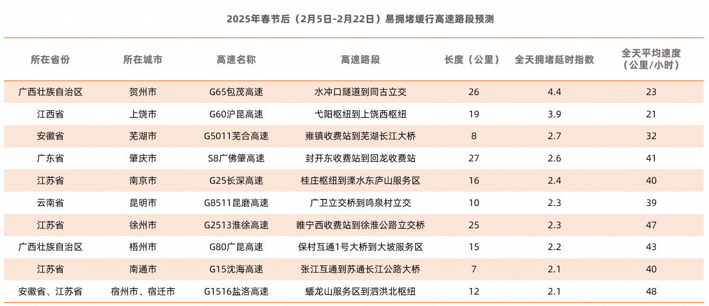 春节后(2月5日至2月22日),预计全国高速易拥堵路段主要为G65包茂高速贺州段(水冲口隧道到同古立交),全天拥堵延时指数约为4.4,全天平均车速约23公里/小时。其次是G60沪昆高速上饶段、G5011芜合高速芜湖段等。