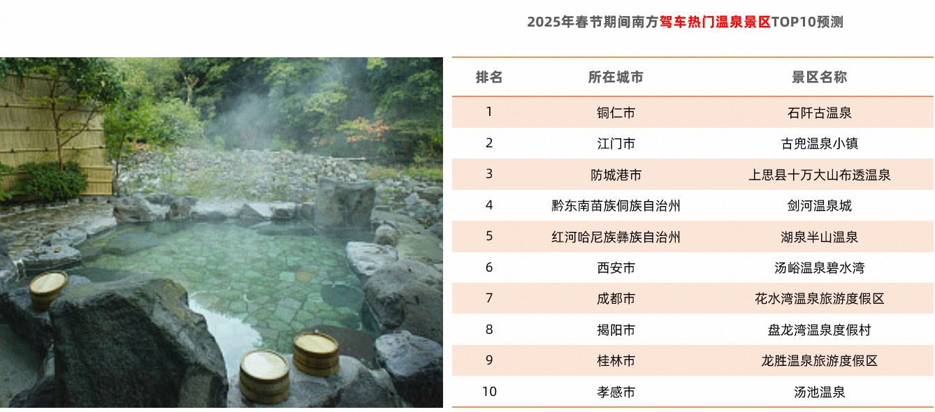 在南方,温泉景区成为冬日的理想避寒胜地。石阡古温泉以其历史悠久和天然水质备受欢迎,位居南方驾车热门温泉景区之首。古兜温泉小镇以其舒适的设施和优美环境位列第二。而防城港市的上思县十万大山布透温泉则以其清澈泉水和宁静氛围排名第三,是放松身心的不二之选。