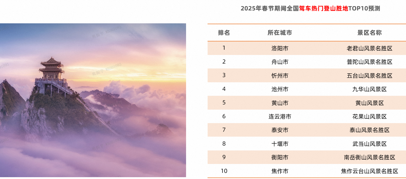在登山胜地方面,洛阳市的老君山风景名胜区以其壮丽的自然风光和深厚的文化底蕴,预计将成为全国驾车热度最高的登山目的地。紧随其后的是舟山市的普陀山风景名胜区、忻州市的五台山风景名胜区以及池州市的九华山风景区,这些地方以其独特的宗教文化和自然景观吸引着众多游客。