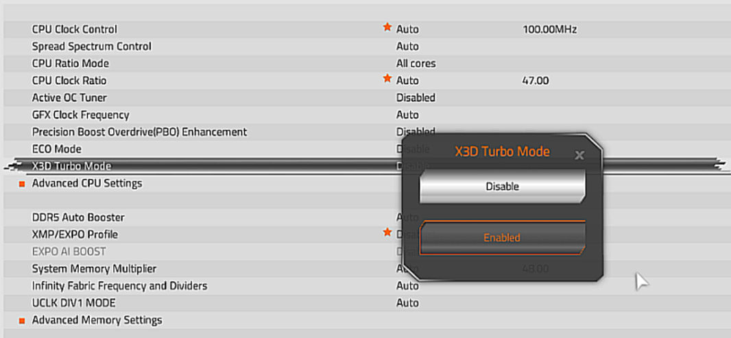 ▲在BIOS中X3D Turbo Mode,可以提升锐龙处理器在一些游戏中的性能,对双CCD的处理器效果更明显