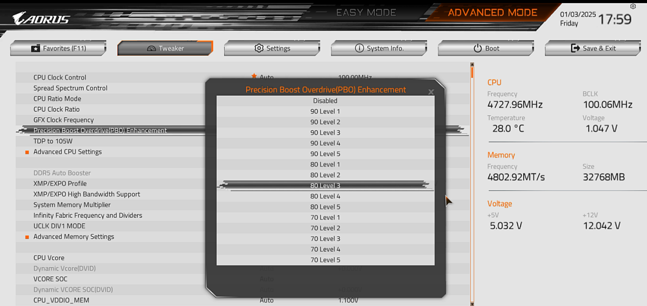 此外,B850冰雕也支持PBO增强模式。我们知道,PBO曲线优化和曲线塑形都需要玩家具备一定的DIY知识才能做到完美细调,而B850冰雕内置的PBO增强模式则简化了这样的操作,玩家只需要选择对应的挡位,即可实现固定温度上限情况下的最佳PBO性能。例如选择80 Level3,就意味着处理器的温度上限为80℃,此条件下系统自动降压,让处理器在功率上限内实现更高的PBO频率。对于不是很懂PBO手调的玩家来讲,这个功能无疑是相当实用的存在。