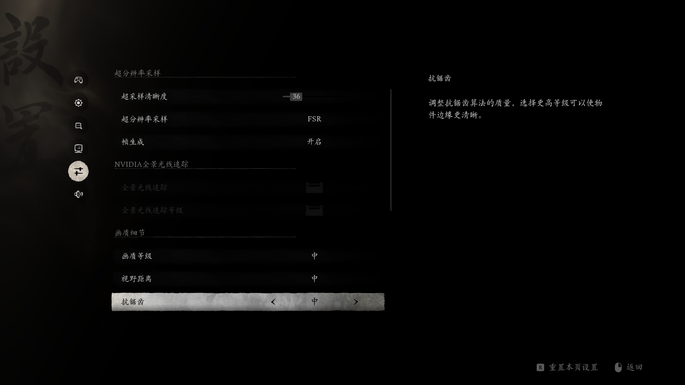 抗锯齿:抗锯齿可以平滑物体的锯齿边缘,增强视觉质量。理论上过高抗锯齿会增加显卡负担影响帧率。不过在这个游戏中并非如此。由于大部分玩家会默认打开帧生成,而帧生成都有着自己的抗锯齿方式,所以其实它对帧率影响没有想象中的大,完全可以开“高”甚至“影视级”!