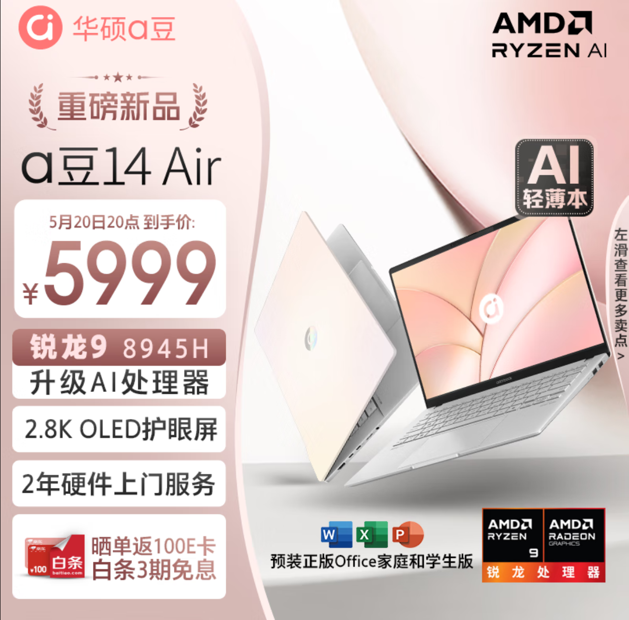 一年一度的电商618大促拉开序幕!很多小伙伴都在趁此机会买一台配置无短板、性能给力、体验出色的AI轻薄本,当然如果还有高颜值机身和全面无忧的售后就更好啦。而类似轻薄本的甜品价格基本处于5000到6000元之间,那么,此价位中,有哪些AI轻薄本值得列入大家今年618的购机名单中呢?我们选了几台符合要求的AI轻薄本供大家参考,其中以华硕a豆14 Air领衔——最近这款产品除了实惠价格外,还有晒单返E卡和白条3期免息等优惠,并且新推出了极具看点的蜜桃甜心新配色,喜欢高颜值+超轻薄机身的小伙伴可别错过~~