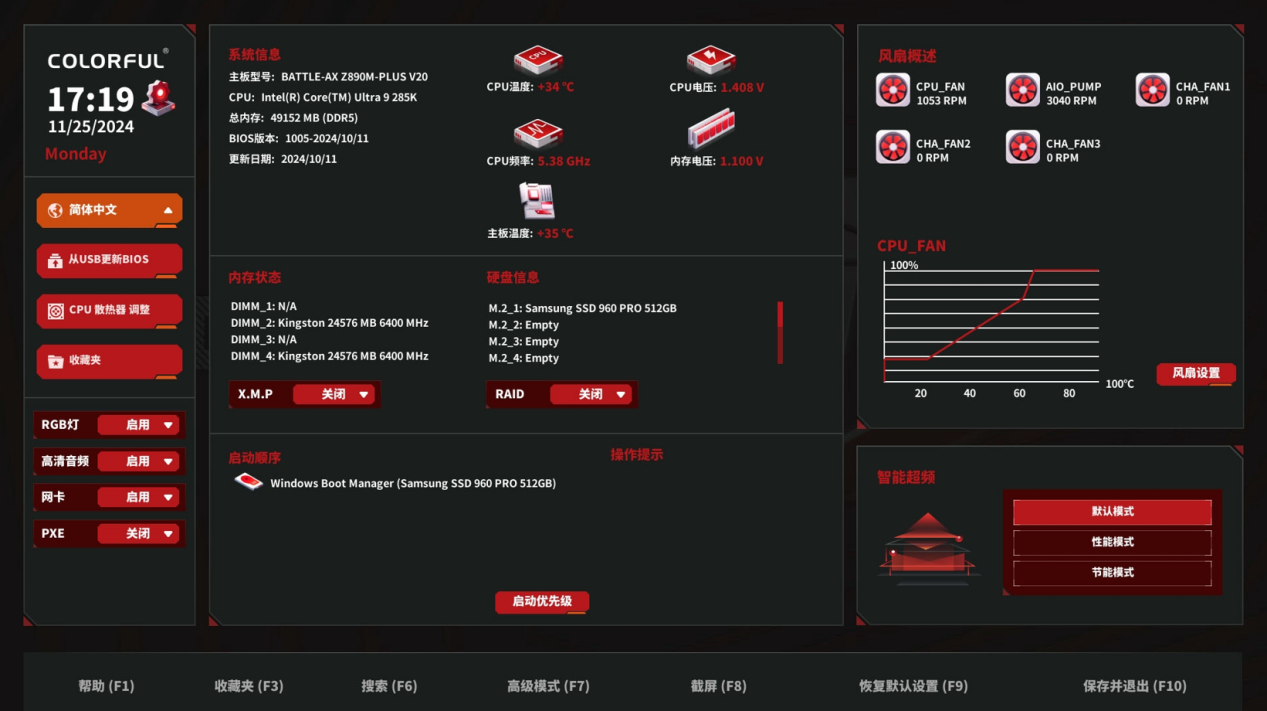 在开始测试前,我们照理要对七彩虹战斧Z890M-Plus V20的各项参数进行调节。全新的MOORE图形化BIOS界面,功能设置合理、操作逻辑清晰简单,让人印象深刻。
