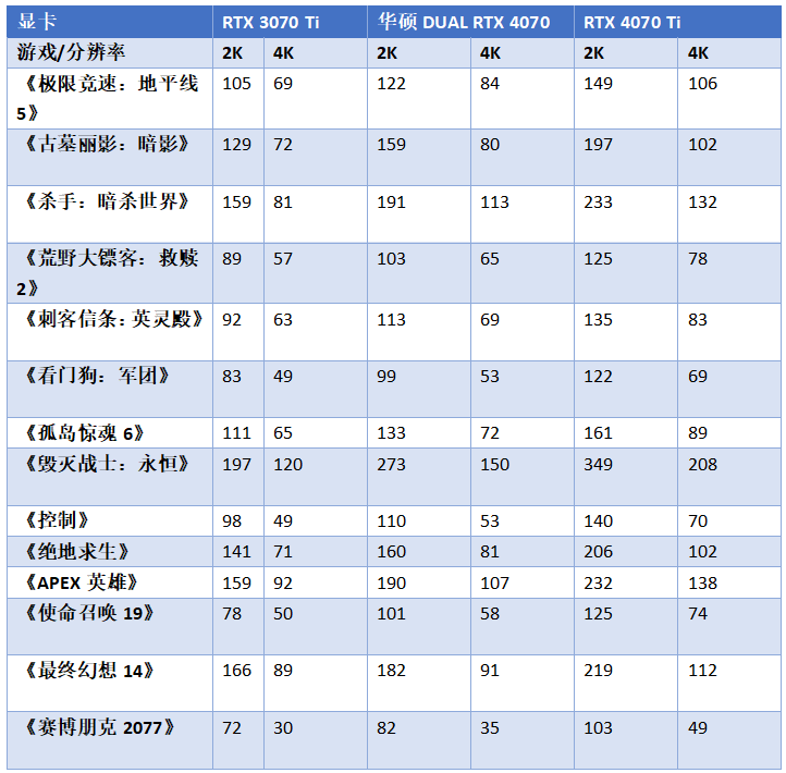 NVIDIA官方给RTX 4070的定位是2K高帧游戏体验,不过我们也加入了4K下的成绩,方便大家参考。来看看纯光栅游戏的表现。