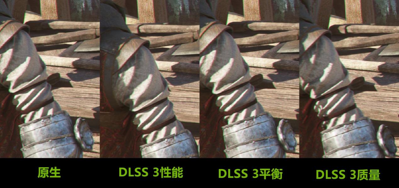 我们用《瘟疫传说:安魂曲》对DLSS 3的画质也进行了测评。从截图细节可以看到,即便是最注重帧率的DLSS 3性能模式,其画面精度也完全不输原生4K,而它的帧率则相当于原生4K的2.5倍以上,帧生成技术为玩家提供了两全其美的游戏体验,可见DLSS 3黑科技的强大。