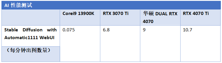 AI应用在今年突然井喷,普及速度之快令人吃惊,未来AI必将成为日常工作必须掌握的技能。我们知道NVIDIA很早就开始布局AI计算,CUDA的生态圈在业界无可匹敌,到了RTX 40时代,更是成为了AI应用的必备利器。这里我们就用Stable Diffusion来测试RTX 4070在AI出图方面的性能。出图的参数配置如图,从测试成绩可以看到,RTX 4070每分钟可以出图9张,达到了RTX 4070 Ti的85%,领先3070Ti接近三分之一。如果出图分辨率更高,对显卡显存容量的要求也会更高,这方面12GB显存的RTX 4070无疑也比8GB显存的RTX 3070 Ti更有优势。而纯CPU出图几乎没有效率可言。
