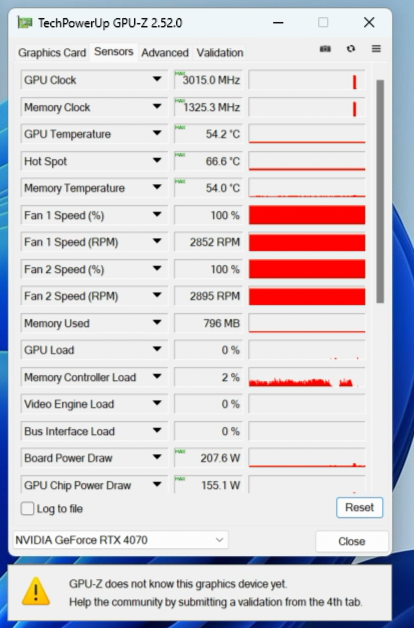 同时,虽然是双风扇显卡,但在华硕独特的散热体系加成下,我们通过华硕的ASUS GPU Tweak III软件,通过简单操作,也进行了简单的200/100超频测试,成功将这张卡核心频率推上了3015MHz,TGP达到了207.6W,而此时双风扇转速也达到了100%,因此GPU温度反而略低于默认烤机时: