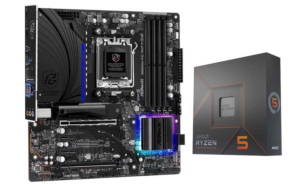 我们为锐龙5 7600X选择的座驾是华擎B650M PG Riptide。尽管是一款M-ATX小板,外观配色上采用了黑灰配色设计。华擎B650M PG Riptide依然采用的是12+2+1相供电设计,如此强悍的配置支持锐龙5 7600X绰绰有余,就算是搭配更高端的锐龙7000型号也不在话下。与此同时,主板的DDR5内存插槽最高可以支持6200+MHz(OC)频率的内存。受限于主板面积,华擎B650M PG Riptide只提供了1个PCIe 5.0×4 M.2插槽和1个PCIe 4.0×4 M.2插槽,基本能满足连接高速SSD的需要了。需要注意的是,华擎B650M PG Riptide这款主板并没有配备无线网卡,在选择的时候要注意。