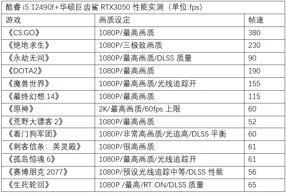 从实测来看,这个配置组合能够在1080P分辨率下畅玩各类游戏。在《CS:GO》《绝地求生》《永劫无间》《DOTA2》这样的电竞游戏中,可以提供非常不错的电竞级帧速,搭配一台1080P高刷显示器可以带来非常不错的电竞游戏体验。在合适的画质下,玩转市售热门3A大作没有问题,在DLSS加持下甚至还可以体验光线追踪带来的游戏画面上的突破。像《原神》《魔兽世界》这样轻量级的网游,即使分辨率提升到2K,依旧可以流畅游戏无压力。