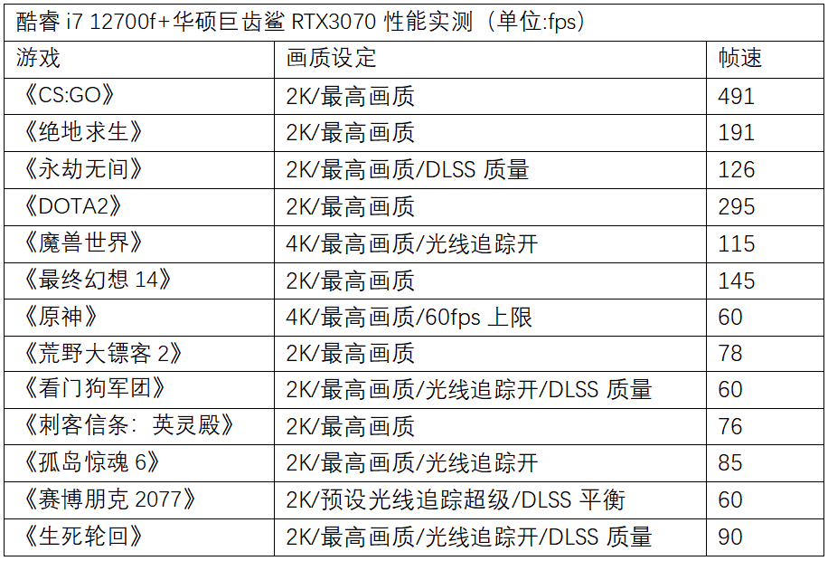 在华硕巨齿鲨RTX 3070显卡的加持下,这套配置组合以2K分辨率最高画质玩转市售热门3A大作没有问题。即便是对配置需求极高的《赛博朋克2077》,开启DLSS后依旧可以在最高光线追踪画质下获得60fps的流畅帧速表现。而像《原神》《魔兽世界》这样轻量级的网游和一些配置需求较低的3A大作,即使分辨率提升到4K,依旧可以流畅游戏无压力。