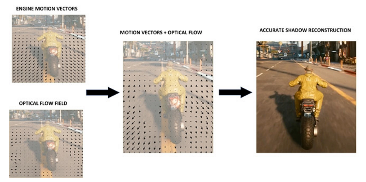 光流加速器可以在DLSS 2的基础上计算两帧之间的光流场,捕捉游戏画面中从第1帧到第2帧之间变化的方向与速度,包含粒子、光线照射、反射等像素信息,通过计算运动矢量和光流场来精确重建画面。