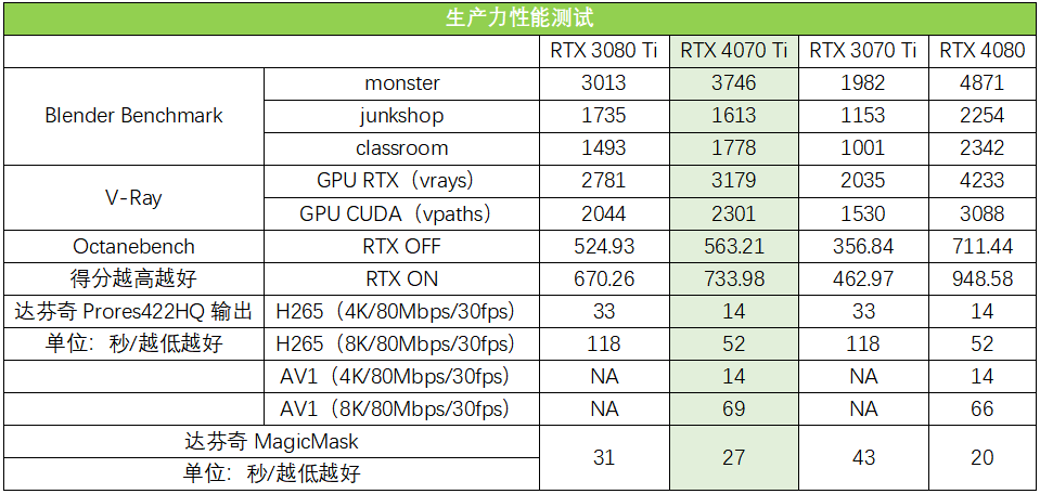 此外,RTX 4070 Ti在3D渲染输出与视频剪辑方面相对RTX 3070 Ti也有巨幅的性能增幅,特别是视频编码性能做到了翻倍,也超过了RTX 3080 Ti(某些应用场景下还能小超RTX 3090 Ti),所以RTX 4070 Ti可以称得上性价比非常高的生产力工具。