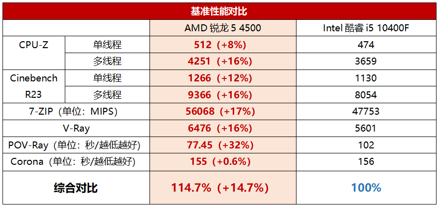 总的来看,不管是生产力性能还是游戏性能,锐龙5 4500都相对酷睿i5 10400F高出10%~14%,等于就是高出一个档次了。