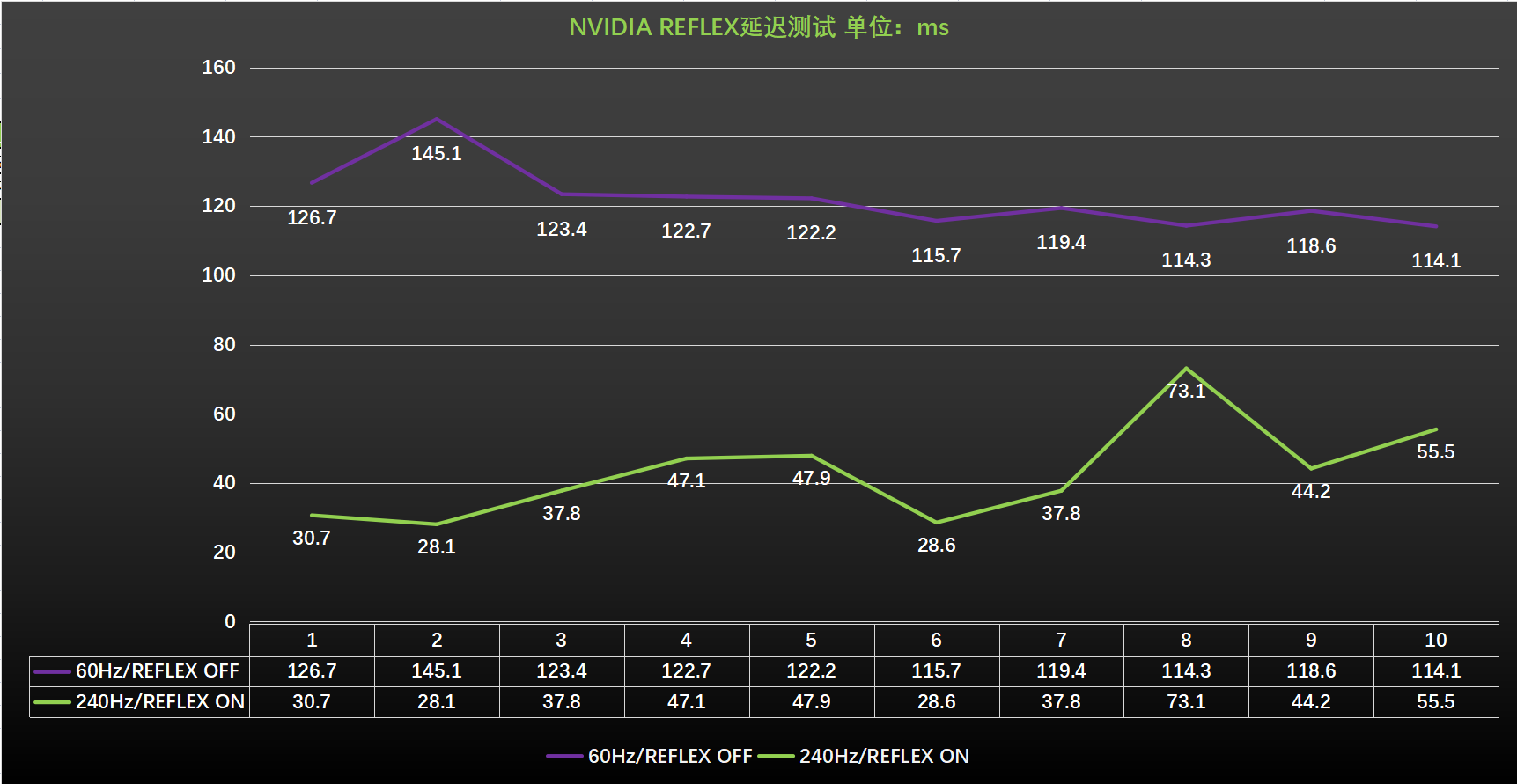 我们在《APEX》游戏中使用“240Hz/REFLEX ON”和“60Hz/REFLEX OFF”两种状态下进行延迟对比测试,可以看到这两种状态下有着明显的延迟差距。在连续10次的射击测试中,60Hz/REFLEX OFF状态下的平均延迟为122.22ms,而在240Hz/REFLEX ON状态下,平均延迟缩小到43.1ms,平均延迟降低了80ms左右,提升相当大。
