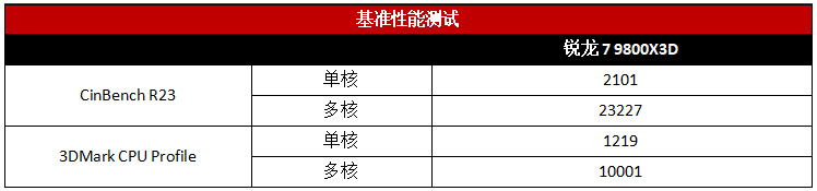 在基准软件测试中,锐龙7 9800X3D的表现同样不错,比如《Cinebench R23》单核成绩为2101分,多核成绩为23227分,与我们之前测试的成绩相比,并无多大差异,表明CPU充分释放出了其性能。