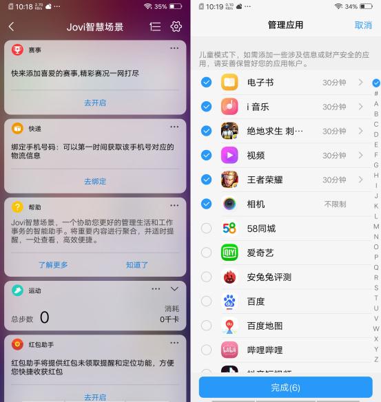 在系统层面,FunTouch OS上的亮点就是Jovi提供的诸多AI功能,诸如智慧场景识别、图片识别、语音助手、驾驶模式等,这些都是大家非常熟悉的功能了,另外还有微信视频美颜、儿童模式(限制APP使用时长等)、应用分身等功能,在以前的评测中都有提及,就不多做介绍了。