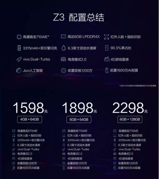 在新品Z3发布之前,vivo官方就通过微博官宣了大部分信息。可以说是几乎没有悬念了,高通骁龙710 AIE加持,支持vivo Dual-Turbo双涡轮加速,正面采用水滴屏,并且支持红外人脸识别……