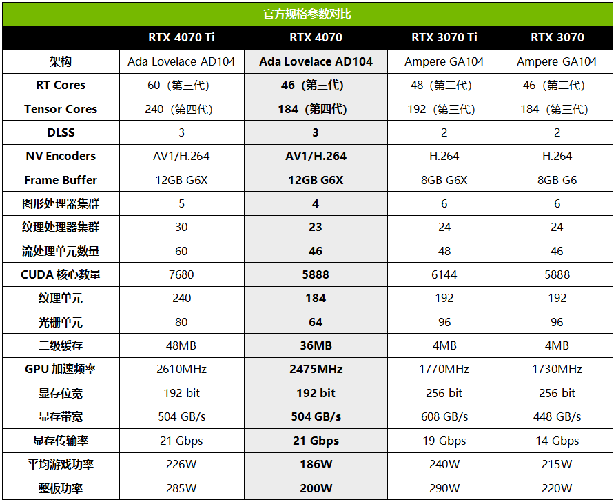 RTX 4070的功耗方面还是颇具亮点的,他整板功率最高200W,官方表示平均游戏功率大约为186W,在游戏中很少能达到200W的功耗上限,这个功耗水平已经和RTX 3060 Ti差不多了,可见这个NVIDIA 4N工艺的Ada Lovelace架构在能效比方面还是有点东西的。