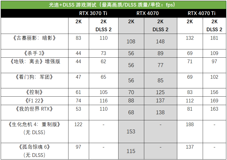 总体来看,开启DLSS 3后,RTX 4070确实可以实现“2K百帧”光追游戏体验,相比RTX 3070 Ti的DLSS 2优势非常明显。这显然也是未来提高游戏帧率的发展方式。