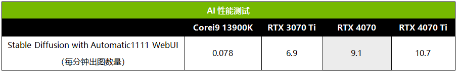 AIGC应用是当下的热点,而NVIDIA的CUDA生态则对AIGC有着更好的支持度。比如最近超火热的Stable Diffusion在NVIDIA GPU就有着最好的效率表现。从Stable Diffusion的WebUI文生图测试可以看到,RTX 4070每分钟可以出图9.1张,速度是RTX 3070 Ti的1.32倍,是RTX 4070 Ti的85%。而使用旗舰处理器出图速度只有RTX 4070的0.9%不到,可见这方面RTX 4070也是非常高效的存在。