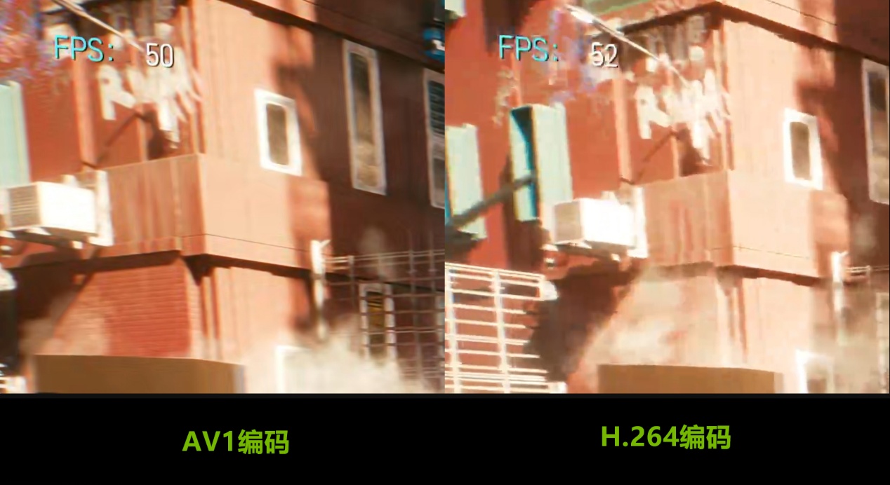 说到RTX 4070的AV1硬件编码,就不得不提同码率下AV1相对H.264的画质优势。我们使用4K/60fps/10Mbps的规格分别用AV1编码和H264编码来录制《赛博朋克2077》的游戏视频,从截图对比可以看到,AV1编码画质可以说是好出H.264几个档次,可见对于有视频转码需求、在线流媒体播放和直播用户来说,支持AV1硬件编码的RTX 4070无疑更加具有吸引力。