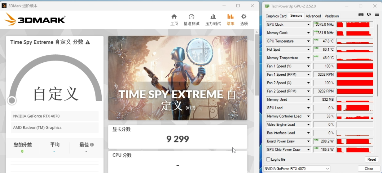 我们经过简单的尝试,将显卡核心频率提升了200MHz,测试中达到3075MHz大关,最终TimeSpy Extreme得分进一步提升,达到9299分。