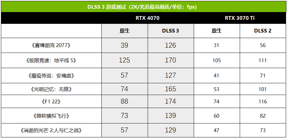 《光明记忆:无限》开启DLSS 3后,RTX 4070能跑到原生2K时2倍多的帧率,大概是RTX 3070 Ti开DLSS 2的1.6倍。