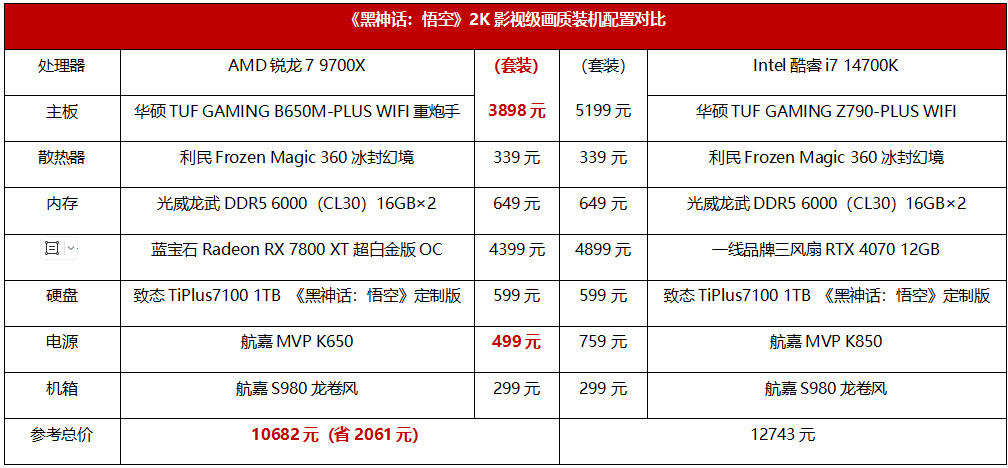 总的来说,如果是要组建一套功耗相对更低、发热相对更小、工作噪声更低、游戏性能更好、性价比更高的《黑神话:悟空》游戏主机,那么很明显锐龙7 9700X在各方面都是超越酷睿i7 14700K的选择。