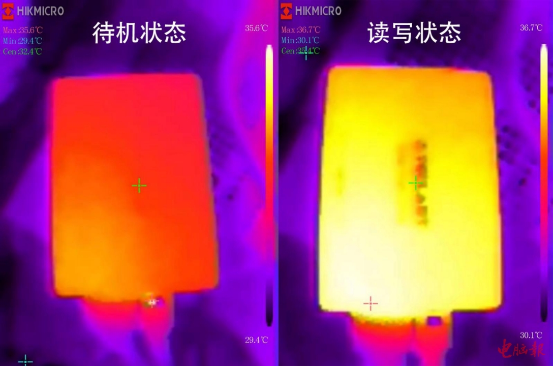 对此,我们还用测温仪分别测量了台电稳影512GB待机及工作状态下的温度表现。在27℃的室温下,待机温度为32.4℃,工作状态也仅为35.4℃,这套主控、闪存本身发热量小是一方面,全金属外壳带来的额外散热效果为这个“低温”表现也贡献了不少。