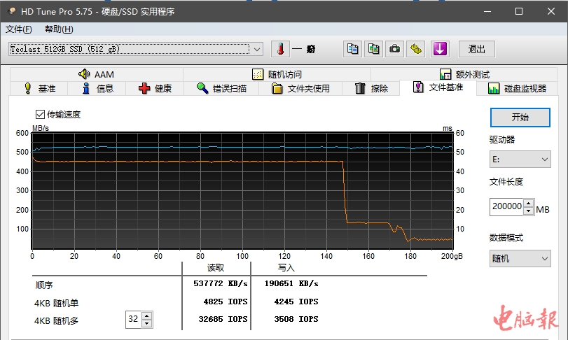 虽然这是一块定位入门级的SSD,我们还是用HD Tune Pro简单测试了一下它的SLC Cache的大小以及缓外速度。通过调节测试测试文件长度,测得在空盘状态下的SLC Cache为150GB左右,这在512GB SSD中算是很大了,超过150GB以后的缓外速度就是QLC的真实成绩了,写入基本在40-50MB/s之间。而当SSD占用了一半的存储空间之后,动态SLC Cache大小掉至28GB,这个时候再复制超大文件就比较吃力了,但对正常使用影响不大。