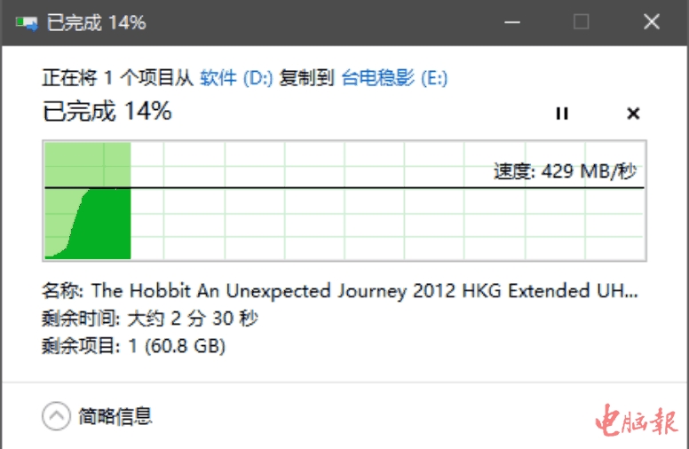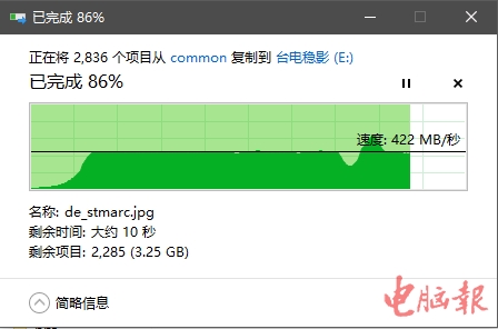 实际应用中,我们首先复制了一部容量为71GB的电影文件,用时165秒,平均写入速度430MB/s,接下来我们选择了《CS:GO》的游戏客户端,总大小25GB/s,小文件比较多,将它复制进稳影512GB,一共用时79秒,平均写入速度316MB/s,不管是大文件还是小文件拷贝的速度都比较不错,至少比HDD强不少。