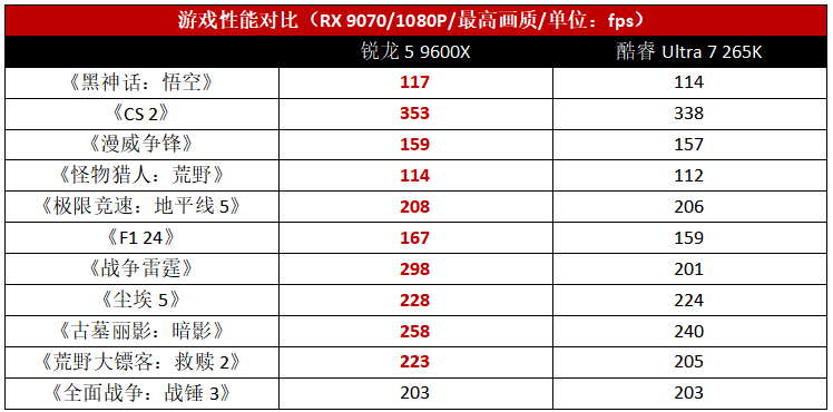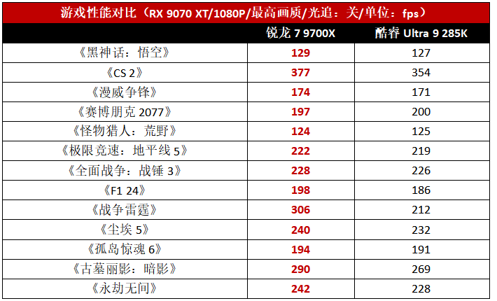 别看与竞品最新旗舰酷睿Ultra 9 285K相比,锐龙7 9700X在核心数量和最高加速频率方面处于下风,但是凭着Zen4架构优秀的IPC性能,和全大核设计更好的兼容性,最终带来了更出色的游戏性能表现。从与RX 9070 XT搭配的游戏表现来看,锐龙7 9700X在多数的测试游戏中都取得了平均帧率上的领先,也可以说是优势很明显了。