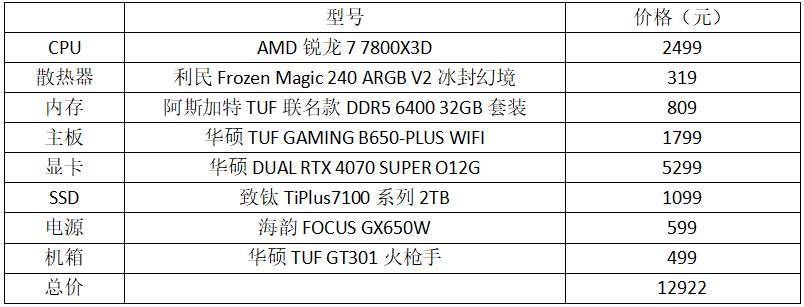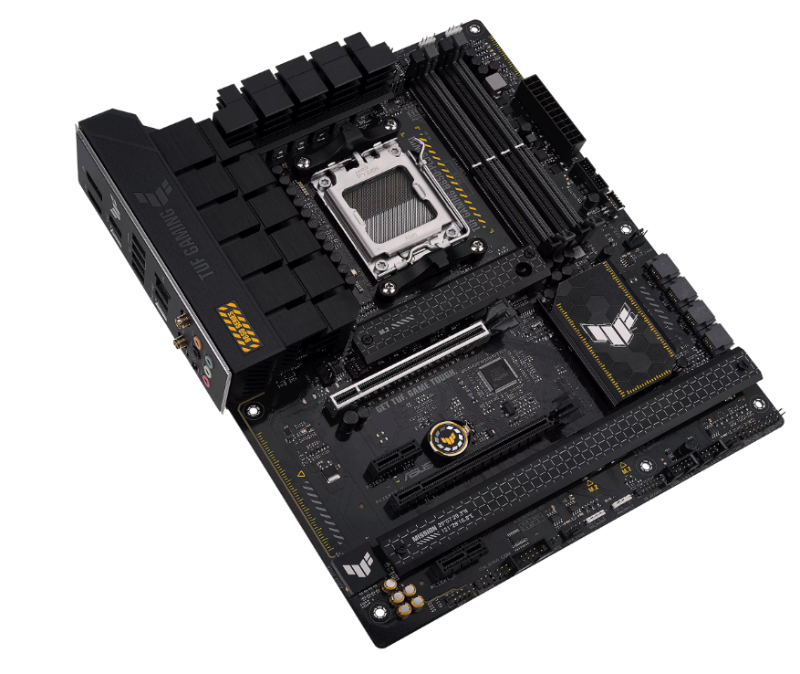 较低的功耗和发热,意味着锐龙7 7800X3D对主板供电和散热器的要求更低。不过考虑到本套配置的高端定位,所以本次站长依然选择了华硕TUF GAMING B650-PLUS WIFI。这款主板为ATX板型,依然是TUF GAMING系列主板标志性的军事风格外观,采用了12+2相Dr.MOS整合型高效解决方案,单相输出电流高达60A,轻松应对锐龙7 7800X3D全力输出的需求。主板提供了4条DDR5内存插槽,最高支持6400MHz(OC)频率,还提供了PCIe 5.0×4 M.2插槽,满足用户对于高速存储设备的需求。