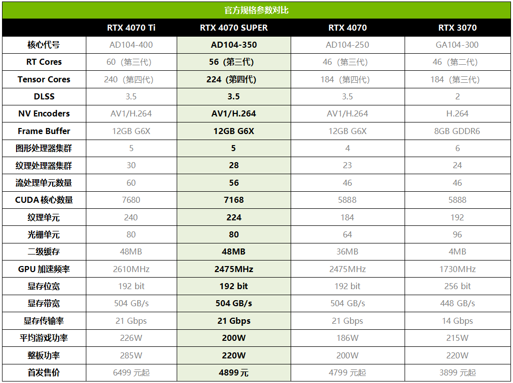 玩家最关心的,当然是RTX 4070 SUPER的规格与现有的两款RTX 4070系列GPU相比有何变化。从官方给出的规格来看,RTX 4070 SUPER核心代号为AD104-350,刚好定位在RTX 4070 Ti的AD104-400和RTX 4070的AD104-250之间,且更接近RTX 4070 Ti,由此大家也可以预估到同样源自AD104的它实际性能可能会更接近RTX 4070 Ti。详细规格部分,RTX 4070 SUPER拥有5个GPC和80个光栅单元,与RTX 4070 Ti相同,而TPC数量缩减了两个,流处理器单元也缩减了4个,对应的CUDA数量缩减了512个,因此规模大约相当于RTX 4070 Ti的93%。相对RTX 4070来讲,RTX 4070 SUPER GPU部分的提升就比较明显了,除了加速频率之外,各项规格都有明显增加,如果单从CUDA规模来看,大约提升了22%。显存部分,RTX 4070 SUPER与RTX 4070 Ti、RTX 4070完全相同,都是192bit/12GB GDDR6X,频率也一样。功率部分,官方给出的RTX 4070 SUPER平均游戏功率为200W,位于RTX 4070 Ti与RTX 4070之间,整板功率为220W,更接近RTX 4070,考虑到规格提升的幅度,这个能效比也是非常出色的。