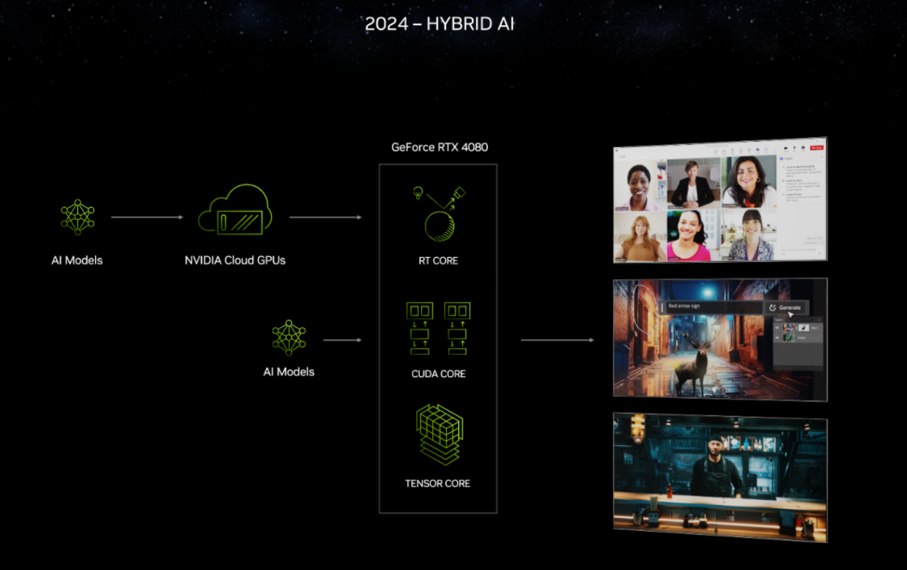 随着各大厂商都在AI方面开始发力,2024注定是AI生态圈野蛮生长之年,作为AI PC时代开拓者的NVIDIA显然要继续保持领军地位。RTX 40系列GPU通过RT Core、CUDA Core和Tensor Core三大核心实现了全新的Hybrid AI加速,可以提供更加全面的AI加速功能和更高的AI加速效率,从而创造出更多强大的AI应用方式。