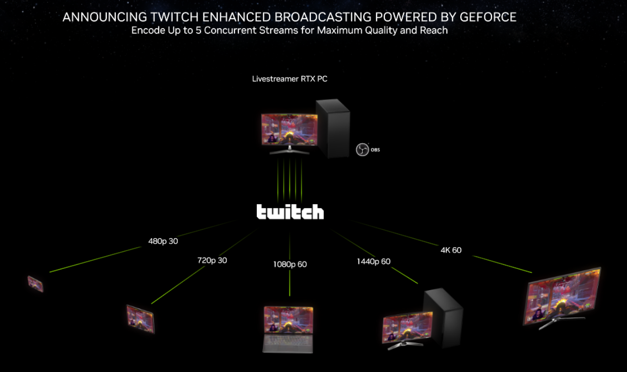视频推流应用部分,NVIDIA与Twitch合作推出了基于GeForce GPU强大编码能力的增强版推流工具,可以同时实现五路不同分辨率与帧率推流,并保证最高的推流质量。这对于有多路推流需求的玩家与主播来讲也是非常实用的功能,而且在未来NVIDIA也会和更多的视频网站合作,让更多的用户享受到此项功能。