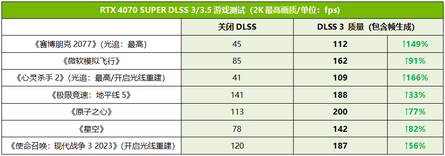 而对于RTX 3070老用户来讲,RTX 4070 SUPER不但带来了大约50%的综合性能提升,还提供了RTX 3070没有的DLSS 3帧生成功能,在支持DLSS 3的游戏中提升幅度可以实现翻倍,确实是非常值得升级的选择。