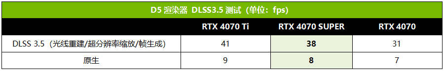 其实DLSS 3.5除了可以在游戏中大显威力之外,在3D设计等生产力软件中也能大幅提升效率和画面质量。例如D5渲染器就提供了对DLSS 3.5的支持,包括了光线重建、超分辨率缩放和帧生成功能。从实测来看,在开启DLSS 3.5之后,RTX 4070 SUPER的效率提升幅度高达375%,同时渲染出来的画面噪点明显降低,因此强烈推荐设计师用户打开对DLSS 3.5的支持,享受最完美的渲染效率与效果。