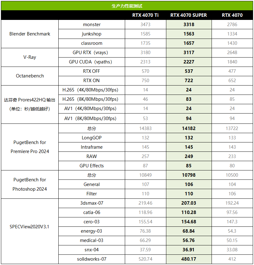 RTX 4070 SUPER拥有多达12GB显存,还有NVIDIA STUDIO加持,很显然除了玩游戏给力之外也是一款能够大幅提升工作效率的生产力工具。从测试来看,在Blender、V-Ray和Octane的3D渲染输出项目中,RTX 4070 SUPER相对RTX 4070的领先幅度大约为11%~21%,比较符合基准性能的差异。在达芬奇Prores422HQ视频编码测试中,RTX 4070 SUPER与RTX 4070表现几乎相同,毕竟它们拥有相同的视频编解码器版本与数量。PugetBench for Premiere Pro 2024视频剪辑综合测试中,3款RTX 4070系列GPU总分表现比较接近,RTX 4070 SUPER领先RTX 4070大约3%。PugetBench for Photoshop 2024综合测试三款GPU的总分表现也比较接近,RTX 4070 SUPER同样平均领先RTX 4070大约3%。