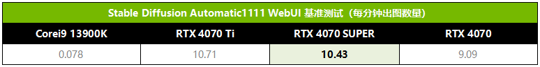 首先是Stable Diffusion的基准测试,使用了NVIDIA官方推荐的标准设置:采样方式为Euler a、采样步数为50、CFG Scale为7.5、每批次出图数为2、批次为10,最后统计每分钟出图数量。从表中可以看到,RTX 4070 SUPER每分钟出图数量达到10.43张,非常接近RTX 4070 Ti的10.71张,比RTX 4070则快了约15%。当然,要是和Core i9 13900K相比的话,RTX 4070 SUPER出图效率是它的133倍。