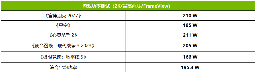 从前面的规格参数可以看到,RTX 4070 SUPER的平均游戏功率可以控制在200W的水平。从我们用NVIDIA FrameView工具监测的情况来看,5款游戏大作中RTX 4070 SUPER的平均游戏功率最高211W,最低166W,综合平均下来为195.4W,差不多等于用RTX 3060的功率实现了与RTX 3090相当的性能,不得不说RTX 40系GPU的能效比表现实在是太优秀了。