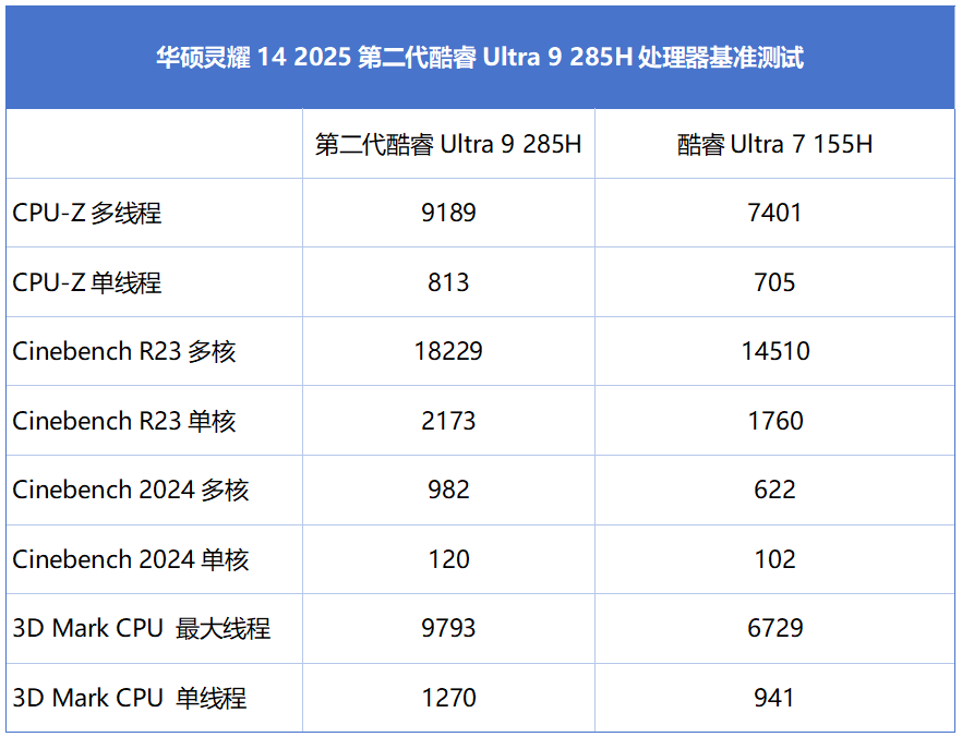 CPU-Z测试是一个负载较低耗时较短的测试项目,对于笔记本特别是轻薄本来说,更多的是凸显出该机的PL2功率性能,也就是爆发性能表现,测试来看,灵耀14 2025搭载的(第二代)酷睿Ultra 9 285H多线程达到了9189。相比之下,上一代16核22线程的Ultra 7 155H多线程为7401,显然,在该项测试中,16核16线程的Ultra 9 285H轻松超越上一代16核22线程的处理器!此外,在3D Mark CPU测试最大线程中,(第二代)酷睿Ultra 9 285H的表现也相当不错。