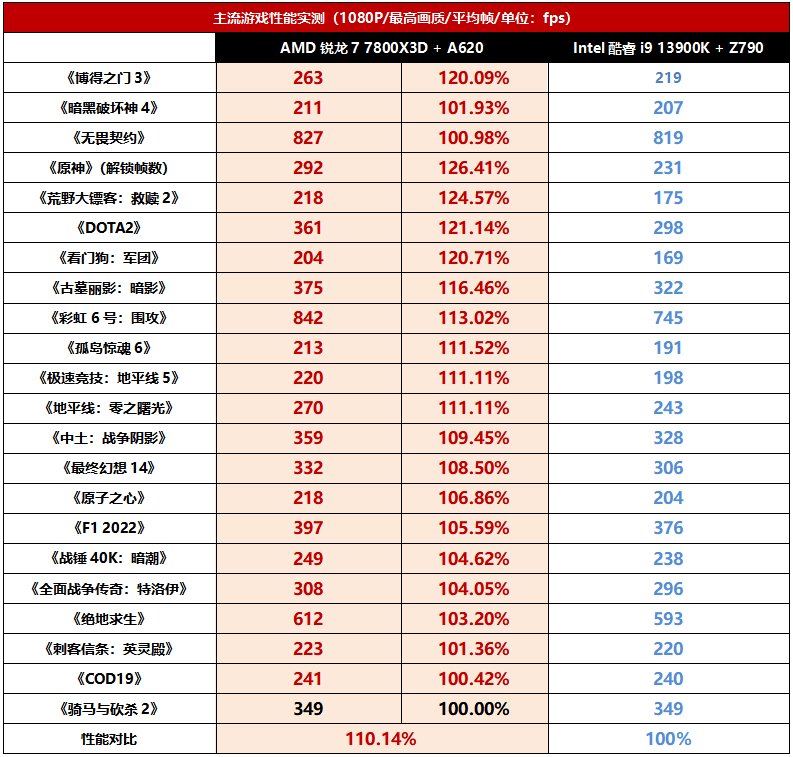 从成绩汇总的情况可以看到,锐龙7 7800X3D最高可领先酷睿i9 13900K大约20%,平均领先幅度也高达10.14%,相当于高出了酷睿i9 13900K一个档次。测试的游戏数目达到了22个,覆盖了各种游戏类型,所以可参考性也非常强。