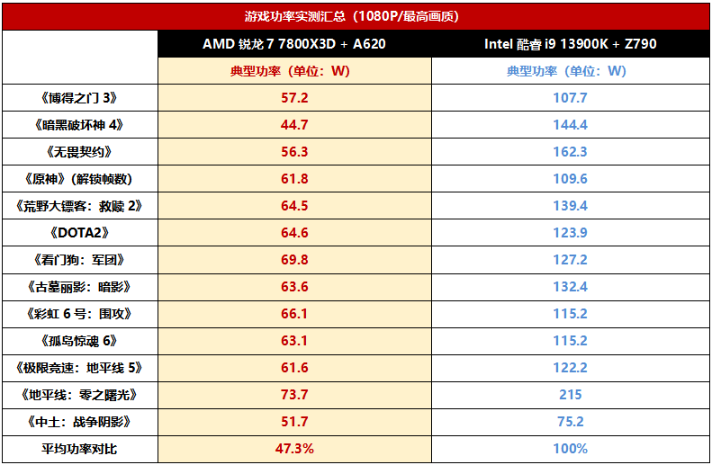 综合主流游戏的功率对比情况来看,锐龙7 7800X3D的平均游戏功率仅为酷睿i9 13900K的47.3%,可见其在能效比方面确实大幅领先了对手。